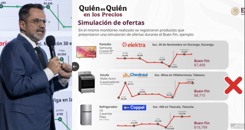 El titular de la Profeco explicó el caso con un ejemplo concreto: una pantalla de 50 pulgadas que mantuvo un precio estable, posteriormente bajó días antes del Buen Fin y, durante el fin de semana de ofertas, volvió a subir, dando la impresión de una rebaja inexistente.