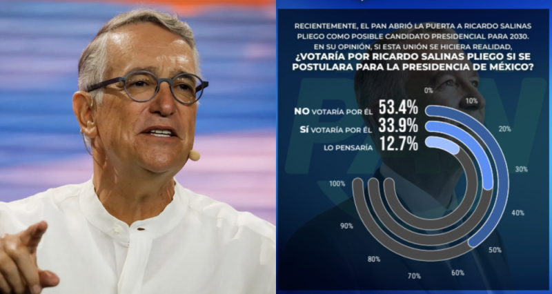 De acuerdo con el estudio, realizado del 24 al 29 de noviembre con una muestra estratificada de 500 entrevistas y un nivel de confianza del 95%, 53.4% de las personas consultadas afirmó que no votaría por Salinas Pliego, mientras que 33.9% sí lo haría y 12.7% declaró que lo pensaría.
